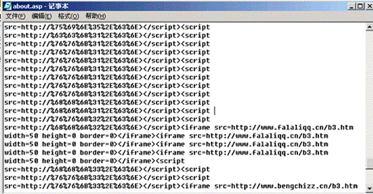 确认被挂代码的方式非常简单,这些代码都有共同的HTML标记:**<\script>或者 <\iframe>**。一般向网页文件加入下载木马的代码都在文件的末尾,语句都是直接调用远程代码文件下载病毒,例如这俩HTML标记里”src“路径都带有“http://”,极少部分挂马者会将下载木马的代码文件直接上传到服务器上。我们略作识别就可以知道哪些文件被挂代码,如: