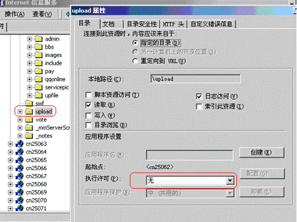先从服务器上确认用于存放上传文件的目录,一般这类目录里面全部都是图片,或者有一部分被上传上来的木马程序,在iis里面展开站点,右键点击目录,选择属性,打开该文件夹的属性窗口。在“执行许可”窗口里,将脚本执行权限修改成”无”,这样,该目录就不具备脚本执行权限了,里面的所有脚本运行时提示403禁止执行的错误。依次查找该站点的其他上传目录,也可以将所有存放图片的目录都作此修改,预防万一。