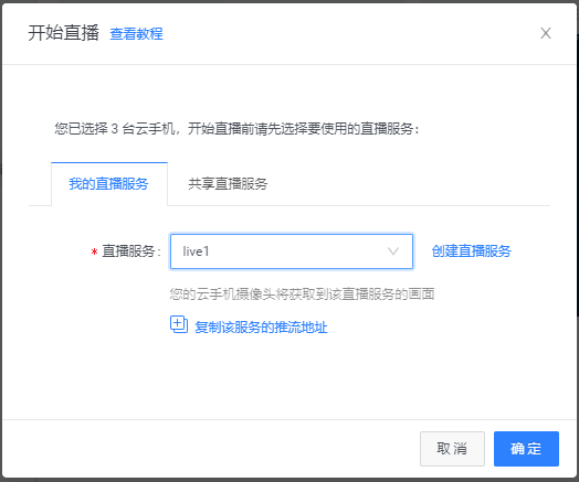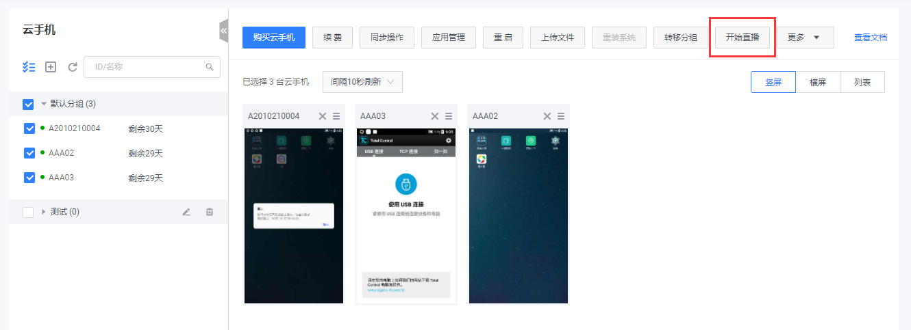 直播服务处于推流中状态时,就可以回到云手机页面,选择要直播的云手机,点击开始直播按钮,如图: