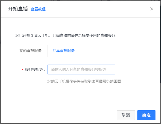直播服务支持创建授权码,通过授权码可以将直播服务的画面分享给其他用户的云手机;