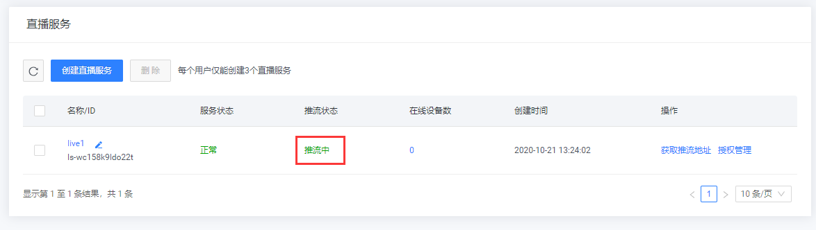 在直播管理页面创建直播服务,创建完成后点击列表操作栏的获取推流地址;