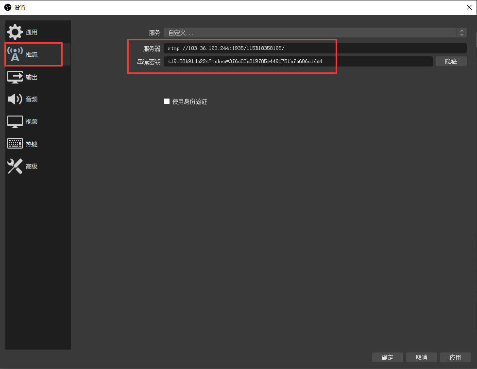 复制推流地址后,在OBS推流软件的设置里配置推流地址,如图: