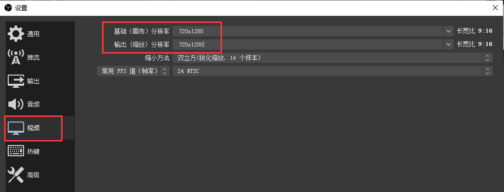 然后在OBS设置里将视频输出分辨率设置为720x1280,如图: